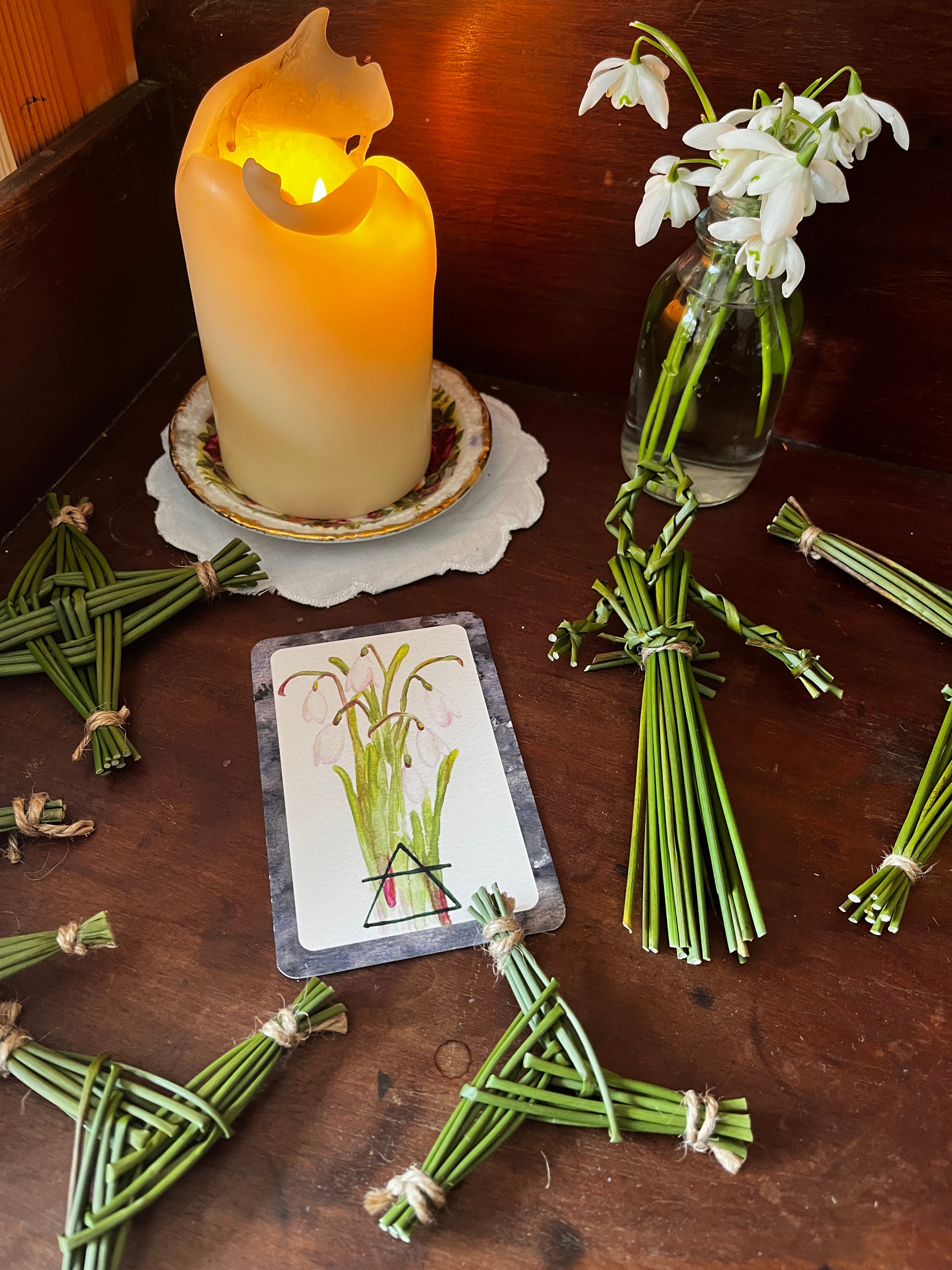 Symbols of Imbolc: three different Brighid crosses, a brideog made of rushes, hearth fire and snowdrops